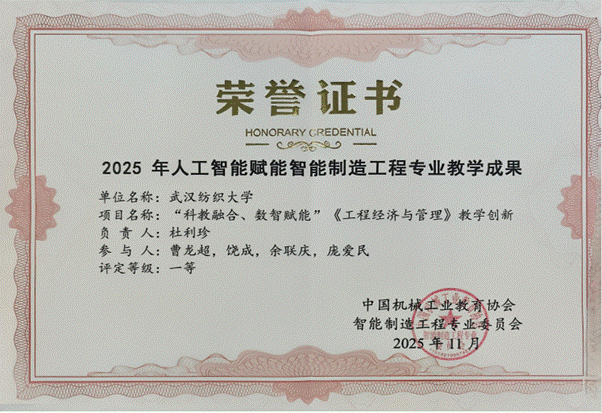 11月21日至23日,中国机械工业教育协会智能制造工程专业委员会主办的智能制造人才培养主题研讨会在福建福耀科技大学圆满落幕。机械学院杜利珍老师受邀参会,其主持的教学成果《“科教融合、数智赋能”〈工程经济与管理〉教学创新》凭借鲜明的创新特色和扎实的实践成效,荣获人工智能赋能智能制造工程专业教学成果一等奖。