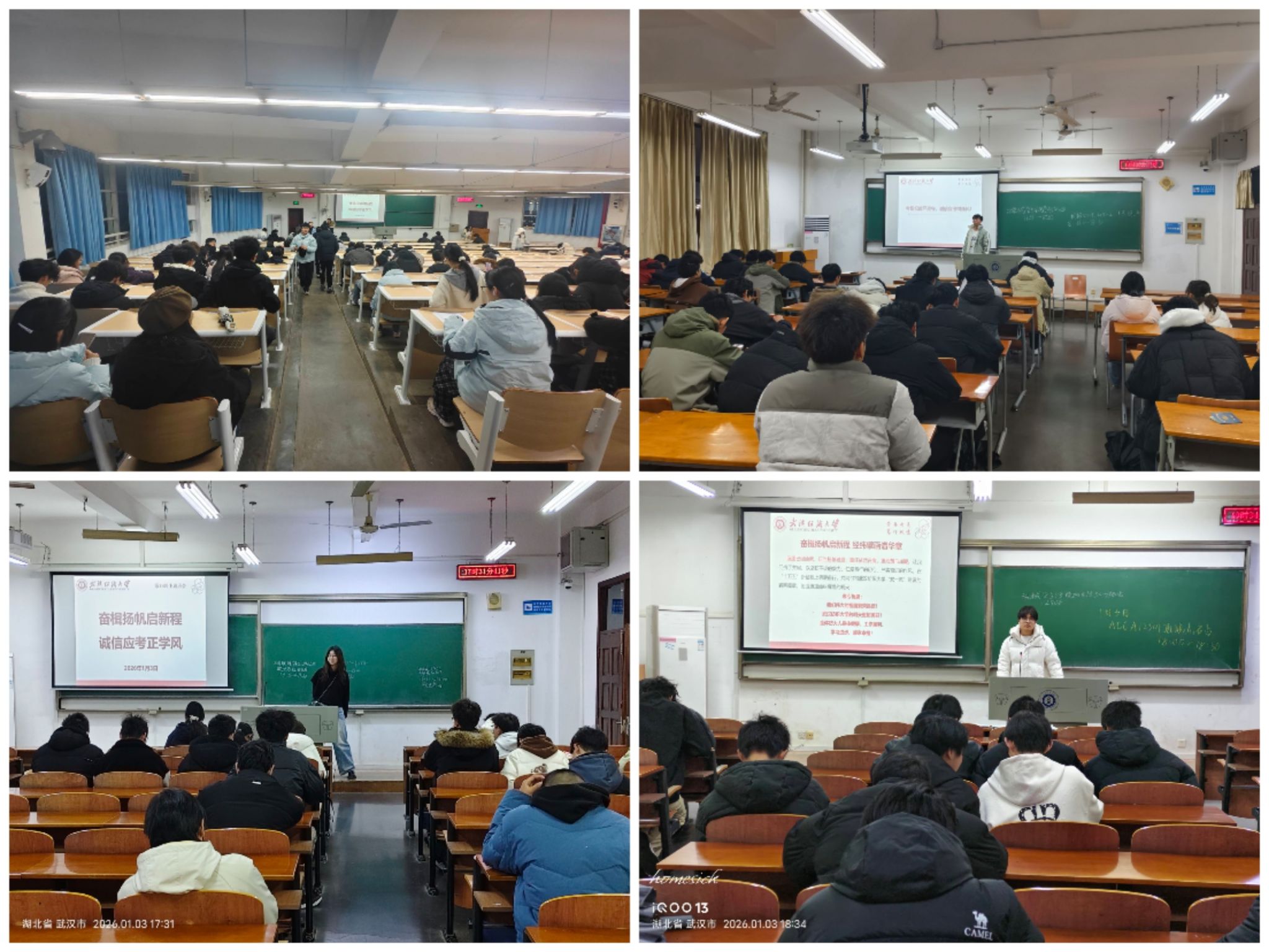 班会上,老师首先带领同学们深入学习了习近平总书记二〇二六年新年贺词和武汉纺织大学2026年新年贺词,共同回顾了过去一年国家发展取得的辉煌成就,描绘了未来的宏伟蓝图,充满催人奋进的力量。同学们对国家发展进步感到自豪,对擘画的美好未来充满信心。此外,班会聚焦诚信应考教育,通过警示教育,引导全体同学应自觉维护考场秩序,以诚实态度涵养优良学风。