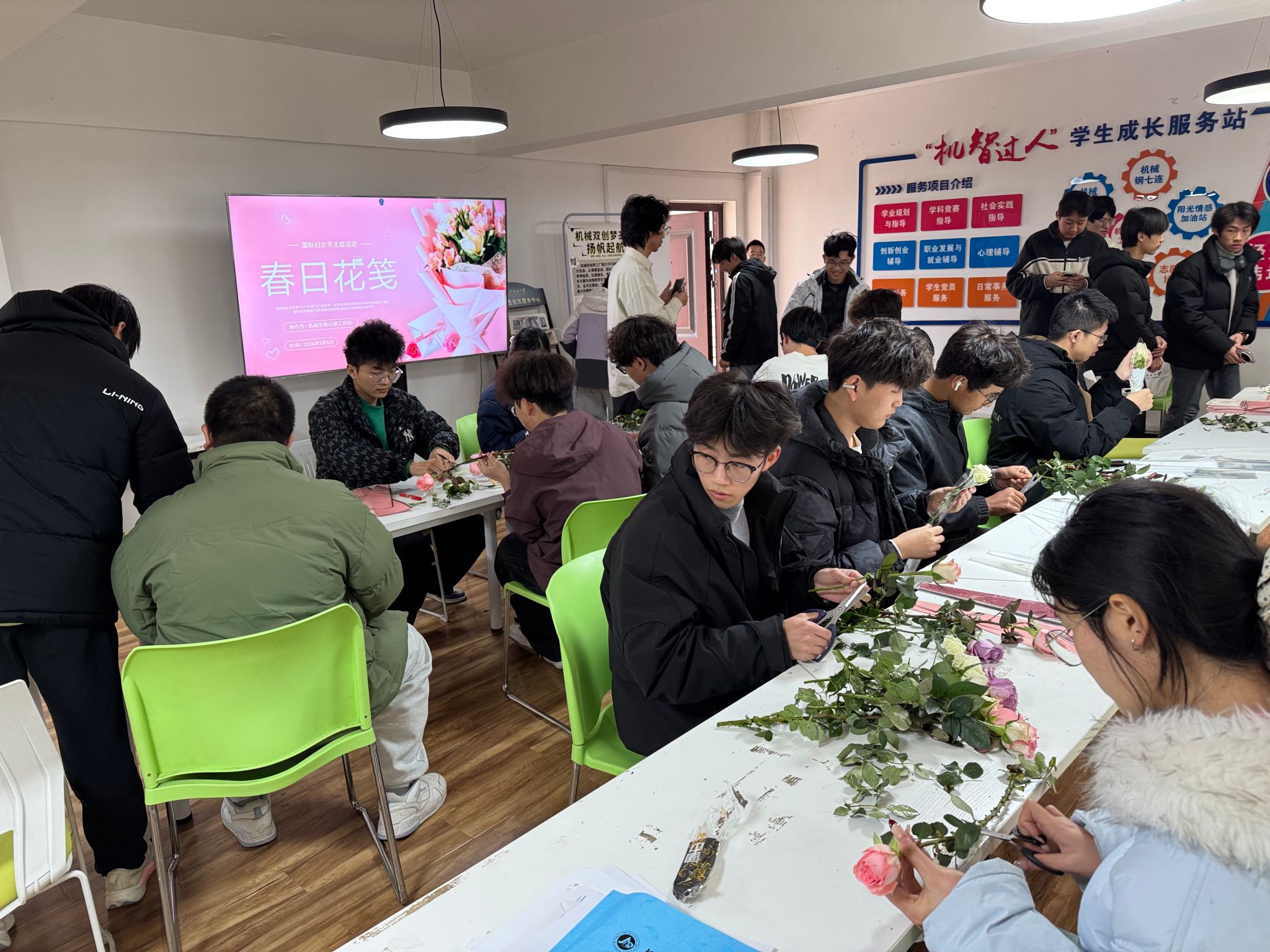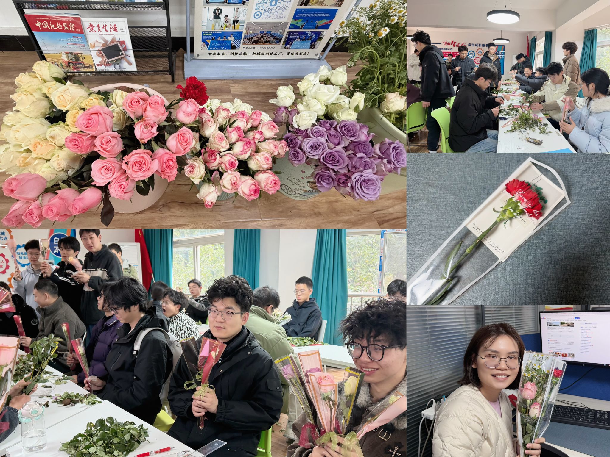 活动现场氛围温馨而热烈,平日里与机械零件、工具为伴的男生们,此刻褪去了操作器械时的沉稳,化身“花艺师”,专注地挑选花材、修剪枝叶、整理花束、精心包装。大家相互协作、彼此交流制作心得,尽管多数人是初次动手制作花束,动作略显生疏,但每一个步骤都饱含用心,每一束花束都凝聚着真诚,最终打造出一束束精致美观、寓意美好的花束。