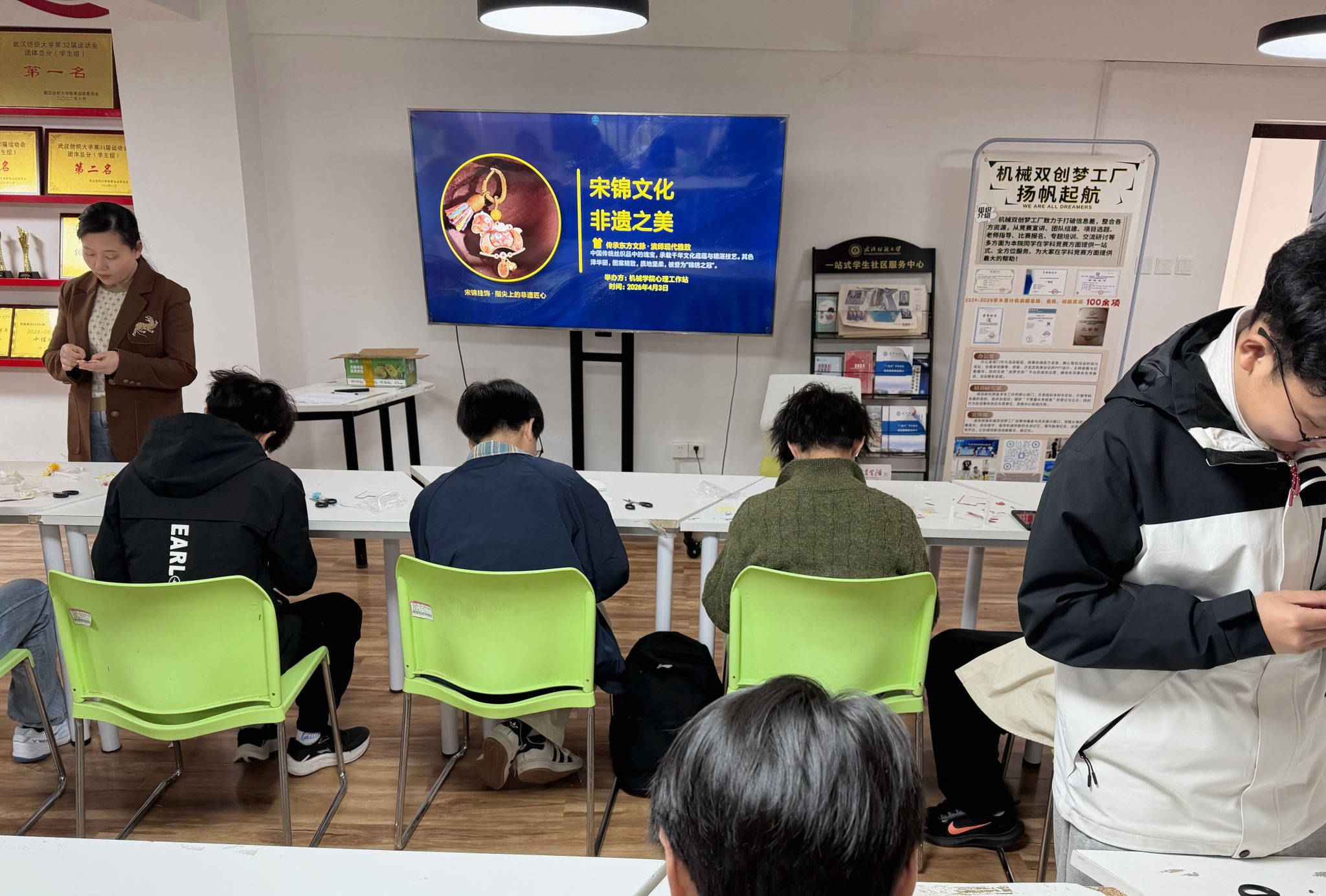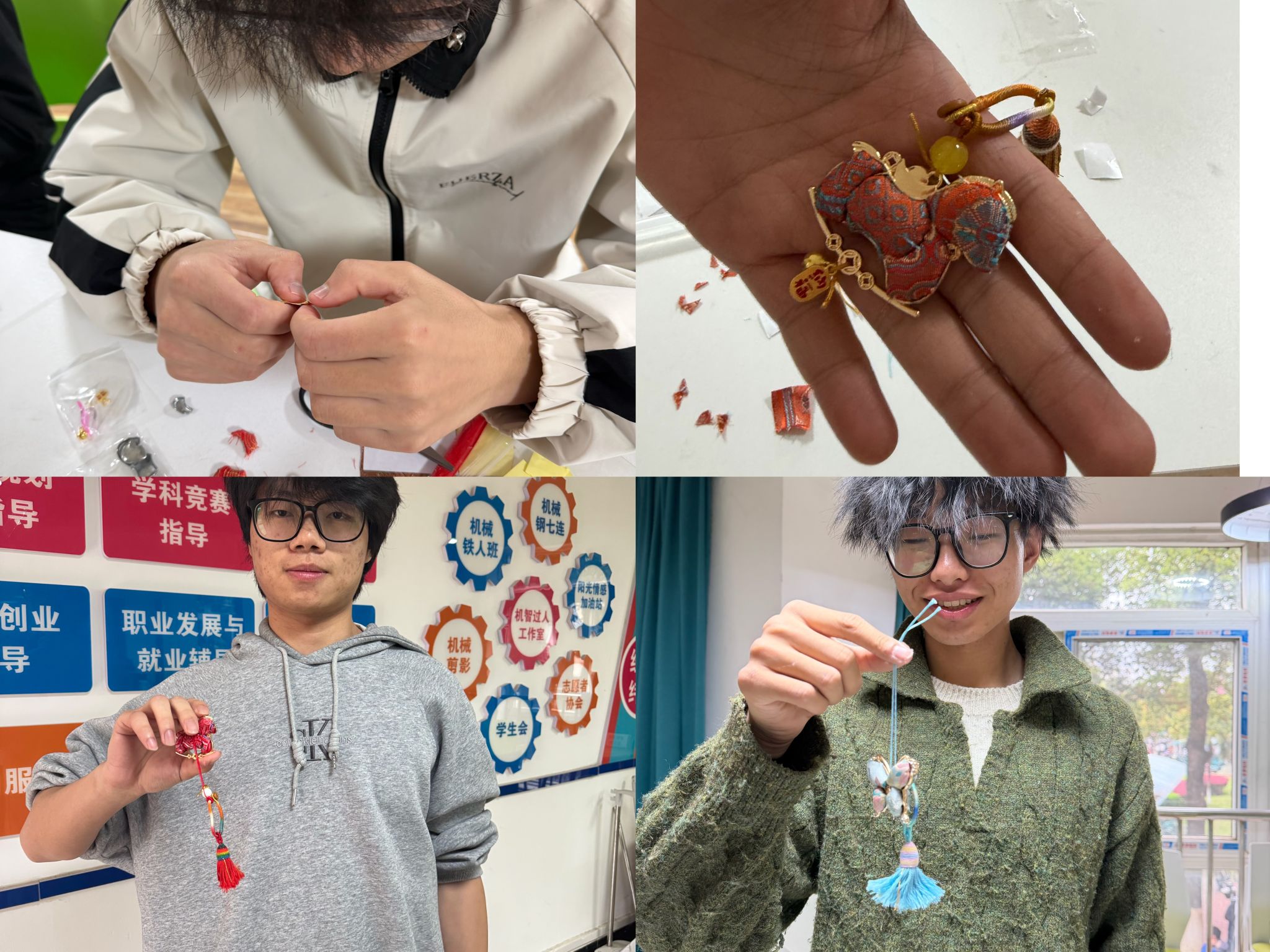 为深入推进大学生心理健康教育工作,恰逢四月心理健康教育活动月,进一步舒缓学生学业压力、培育积极心理品质,同时传承中华优秀传统非遗文化,近日,武汉纺织大学机械学院心理工作站精心策划并开展了以“宋锦挂饰·马到成功”为主题的手工制作活动。活动邀请大一新生代表积极参与,在一针一线的匠心雕琢中,让同学们在非遗体验中释放心灵、收获成长,在协作互动中凝聚温暖、汲取力量。