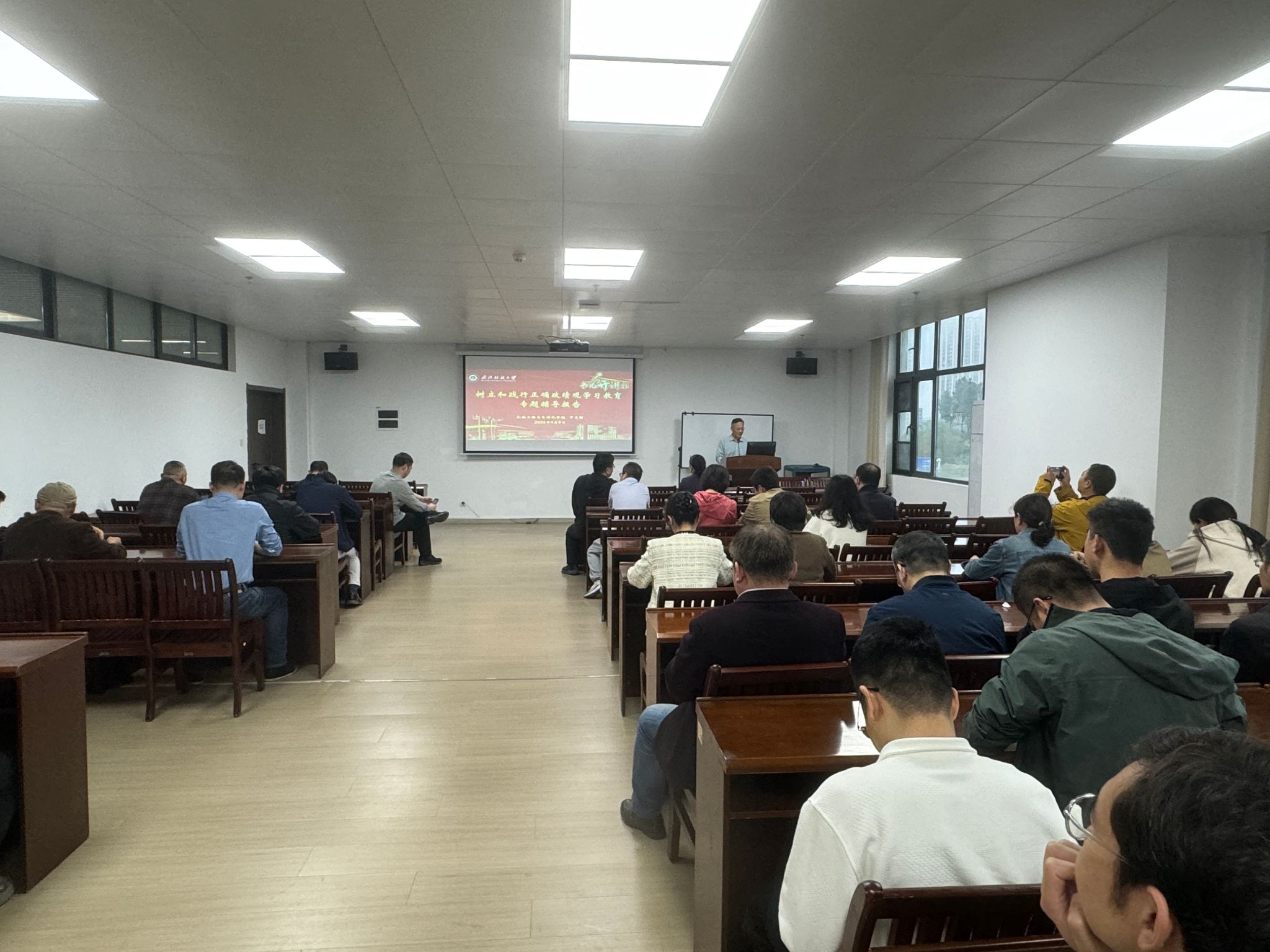 干书记以《以坚强党性铸魂育人 以正确政绩观引领发展》为题作专题报告,从重大意义、核心要义、问题检视和实践路径等六方面展开,结合学院发展的实际,强调党员教师的政绩观要体现在教书育人实效与科研创新突破中,探索将思政元素融入机械专业教学,聚焦国家制造业核心技术攻关。